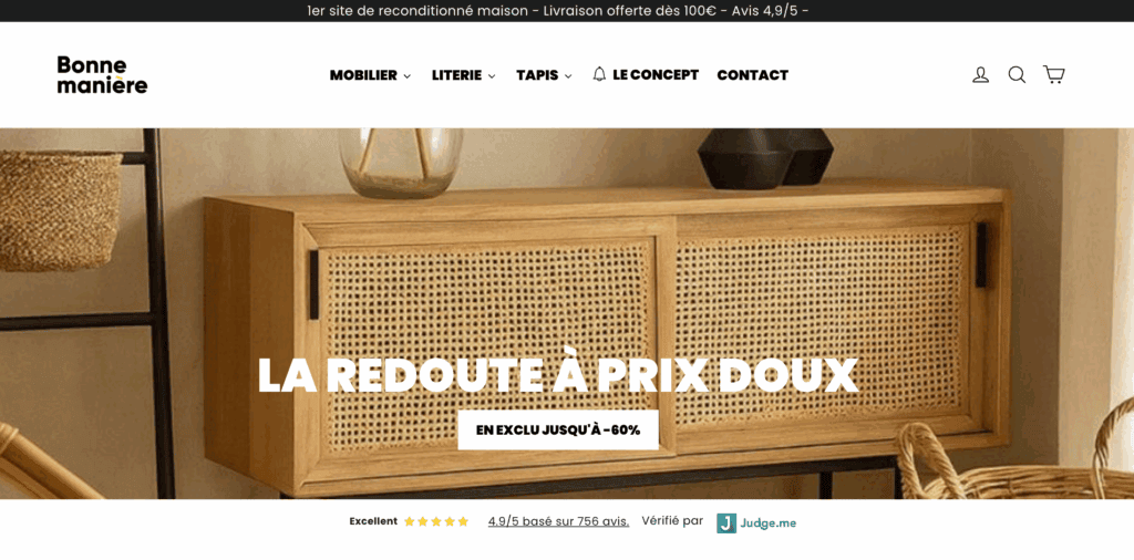 Quand on parle de meubles reconditionnés avec une touche haut de gamme, Bonne Manière est souvent en tête de liste. Le site s’est imposé grâce à sa sélection soigneusement pensée et à son positionnement très esthétique. Les utilisateurs apprécient la qualité des finitions et le côté intemporel des pièces proposées.
