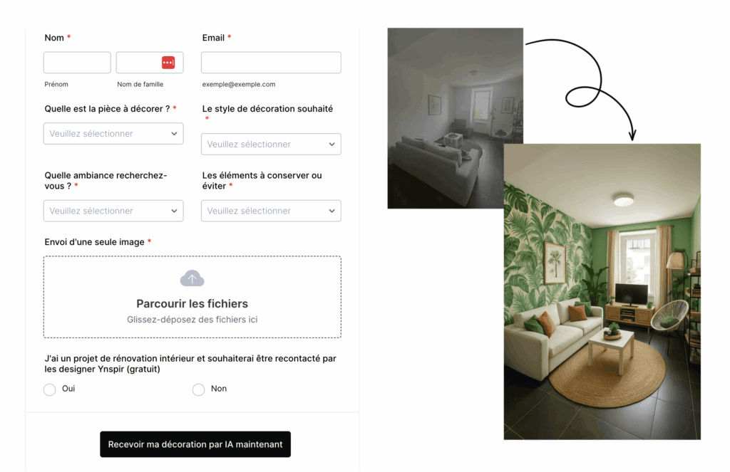 L’outil gratuit de décoration IA proposé par Ynspir permet de transformer une simple photo de votre pièce en un rendu réaliste et inspirant en quelques minutes.