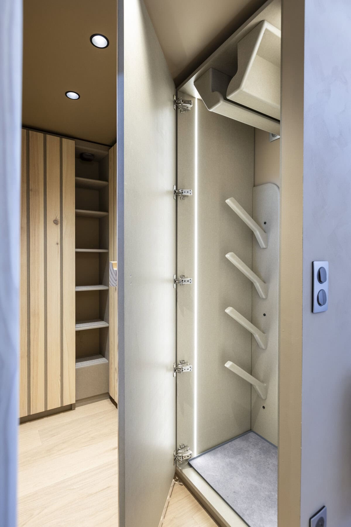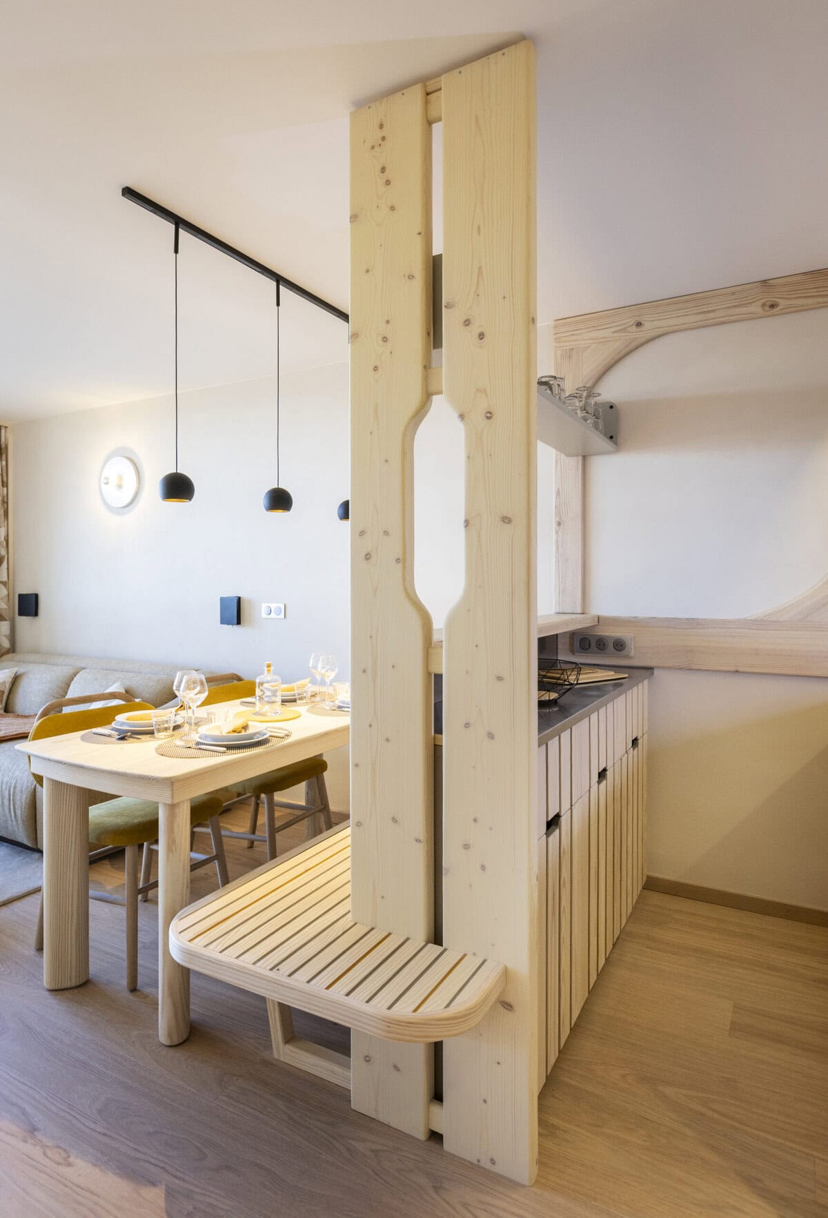 Afin d’améliorer le confort et la fonctionnalité du lieu, de nombreux agencements sur mesure ont été conçus. Les codes d’un design devenu iconique ont été réinterprétés de manière contemporaine : meuble TV intégrant la radio d’origine, table à rallonge papillon, banquette repas, tête de lit, placards aux poignées délicatement dessinées, ou encore le strapontin, clin d’œil à l’ingéniosité des aménagements d’origine.