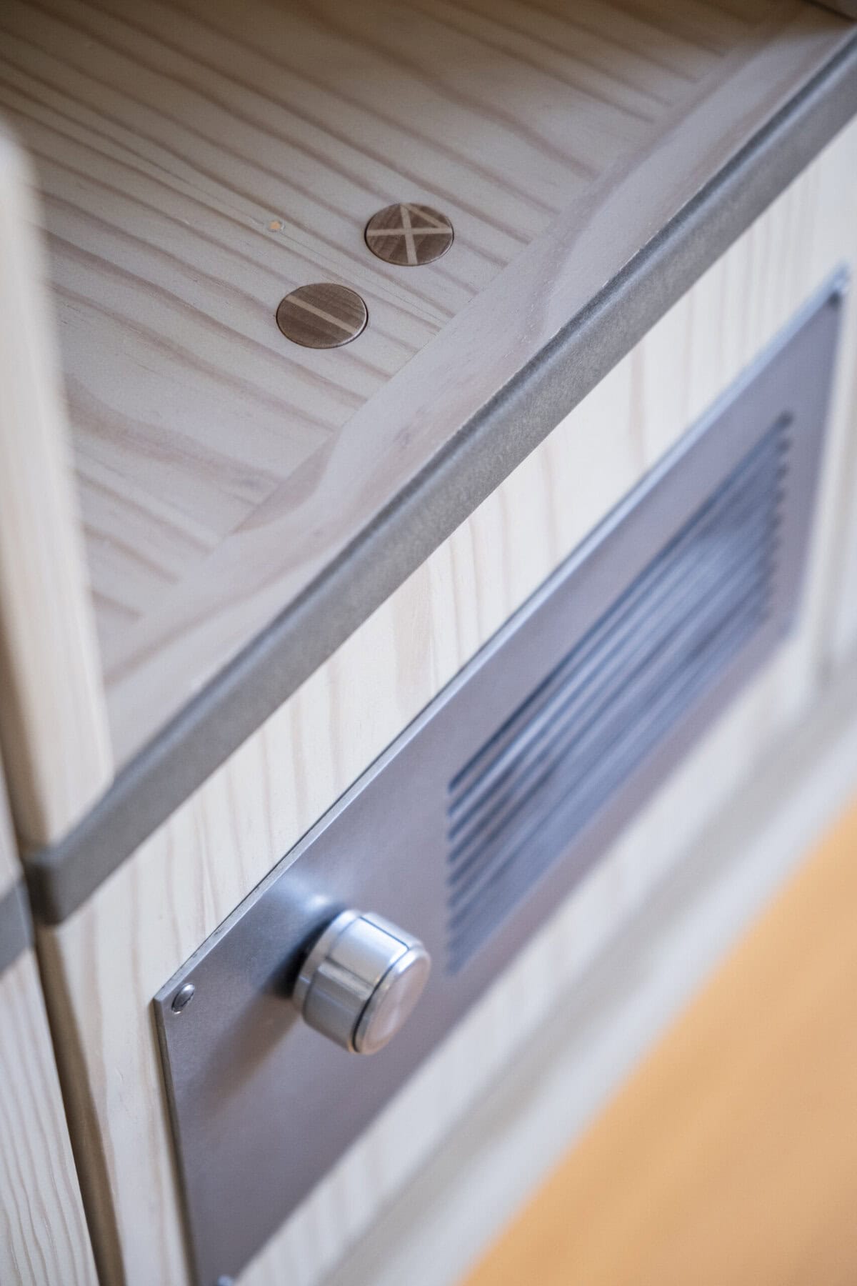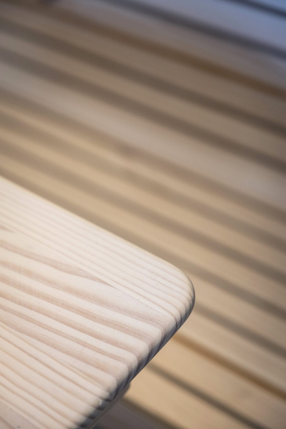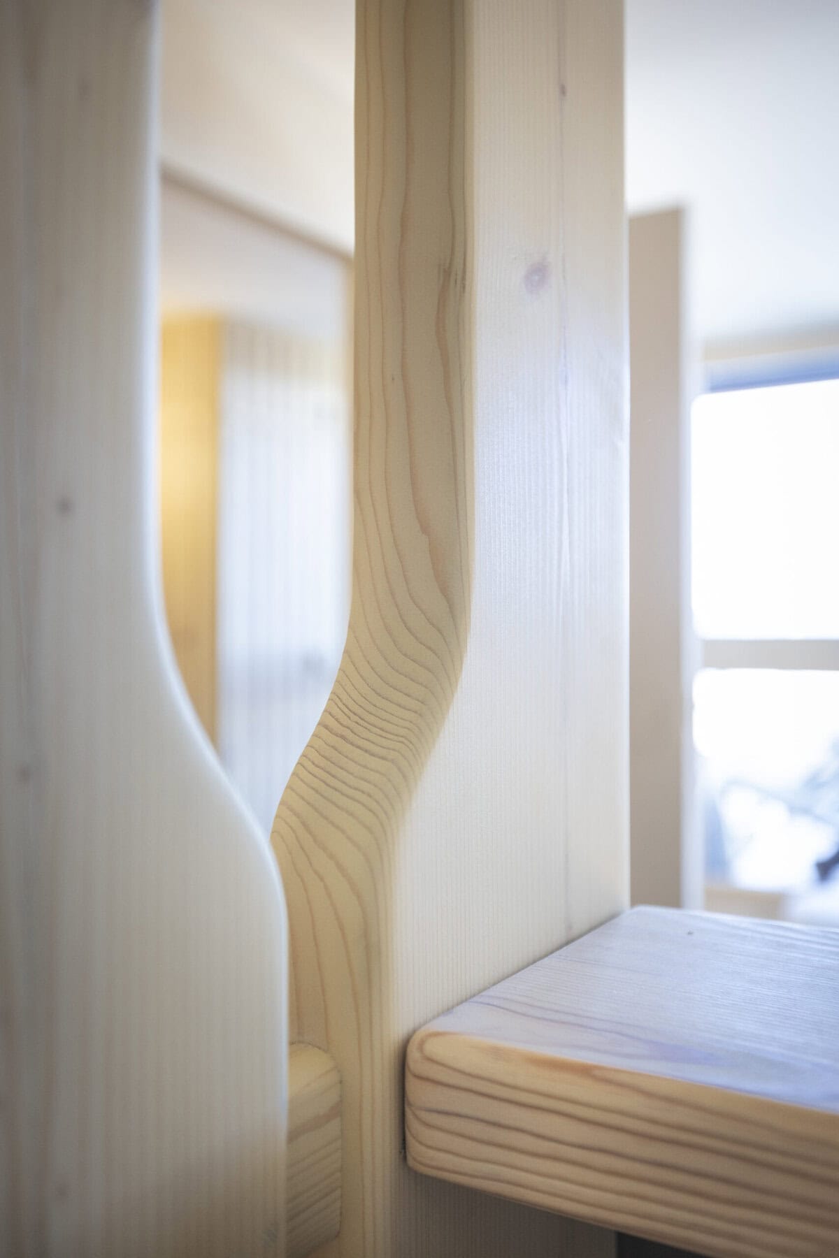 Dans une démarche responsable, Hugo Huchet a utilisé un procédé innovant de contrecollé associant valchromat et pin, permettant de limiter l’usage de bois massif tout en réduisant l’empreinte environnementale du projet. Le choix des matériaux et du mobilier s’inscrit également dans la philosophie de Claire : privilégier des matériaux naturels et sains, respectueux des occupants et de l’environnement. Badigeon de chaux, parquet bois, textiles en lin, laine et chanvre, vinyle recyclé, bois de pin et valchromat composent une palette à la fois authentique et durable.