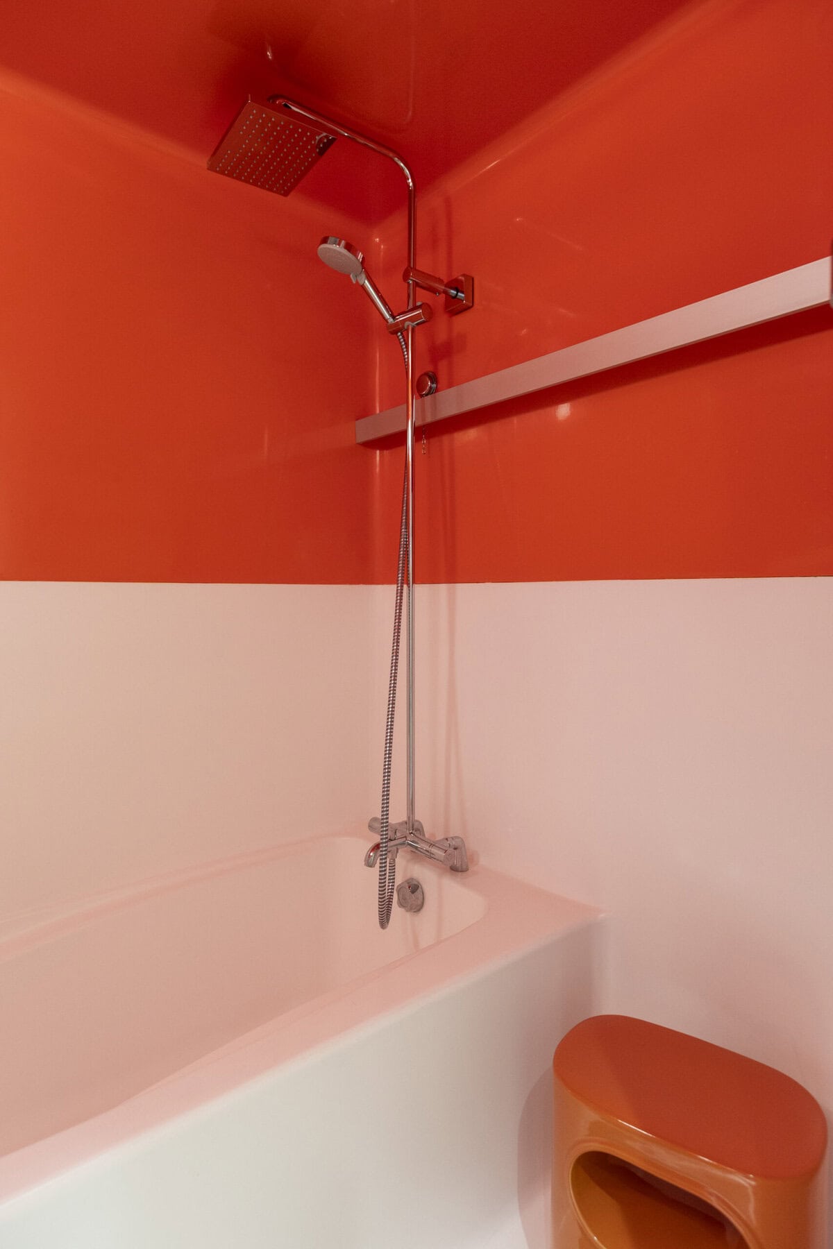 Cette atmosphère zen est toutefois ponctuée d’une note audacieuse et joyeuse : la cabine de douche, rénovée à l’identique de l’origine, dévoile un éclat coloré, véritable bonbon acidulé, rappelant l’énergie créative et la liberté d’expression de Charlotte Perriand.