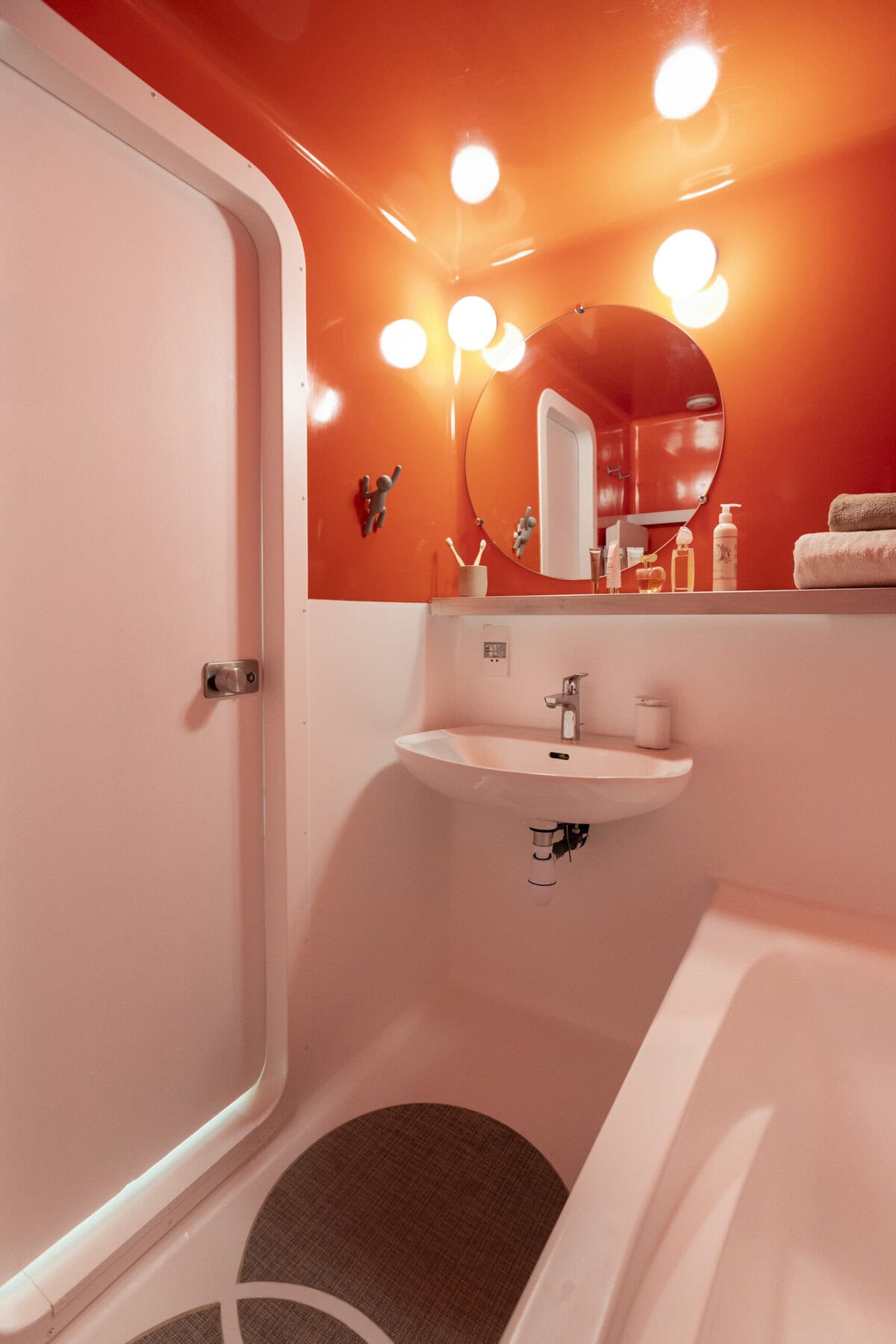 Le parti pris a été de conserver et de sublimer un maximum d’éléments existants, retravaillés avec finesse par l’artisan designer Hugo Huchet. Décors bois, porte hublot de la salle de bain, poignées rondes, coques en fibre de verre de la cuisine et de la salle de bain – aujourd’hui exposées au Centre Pompidou – ont été restaurés et intégrés au projet. Certains éléments ont été détournés, comme le plateau de bar transformé en table basse, ou encore les patères, miroirs et luminaires emblématiques de l’époque.
