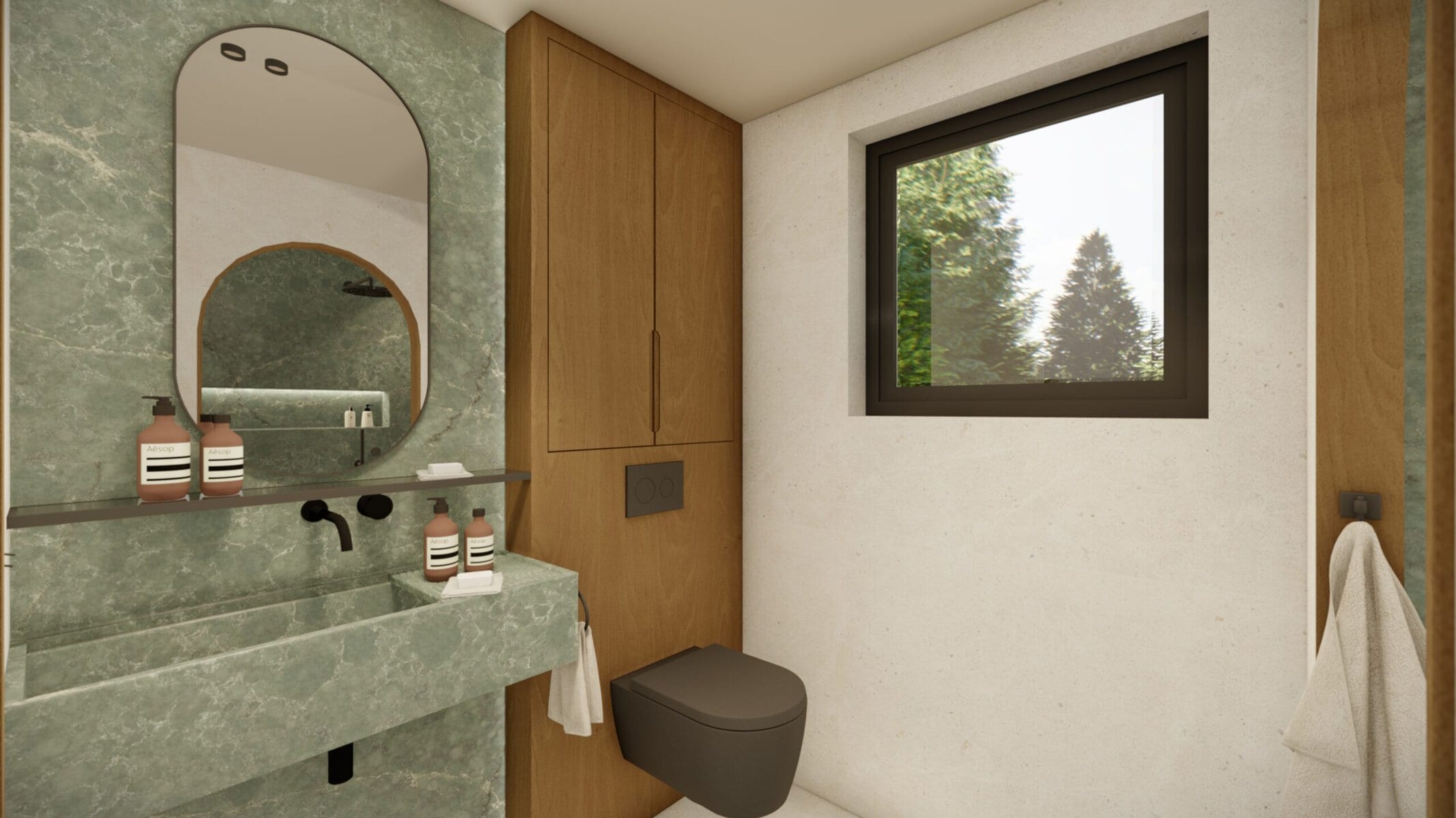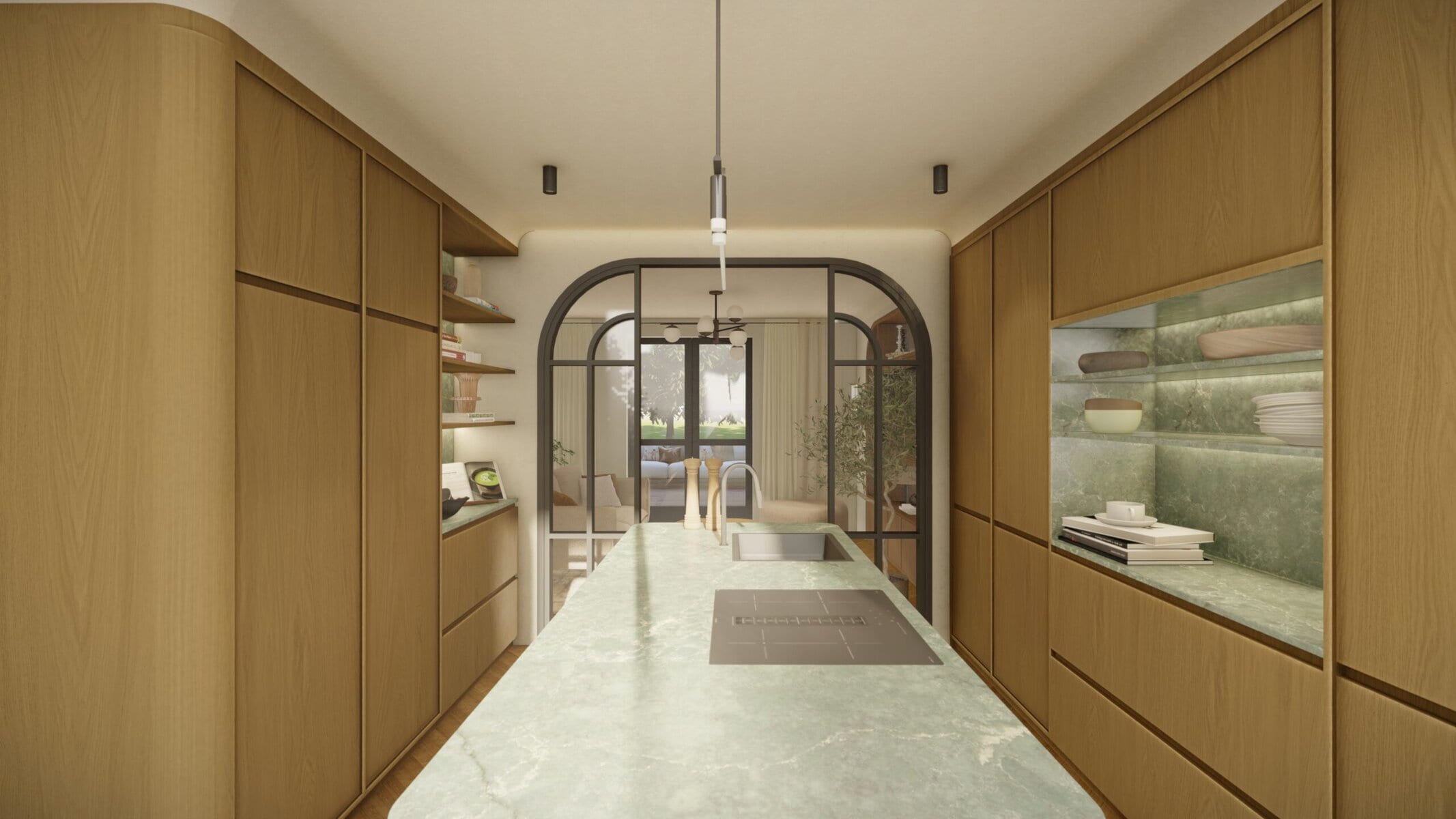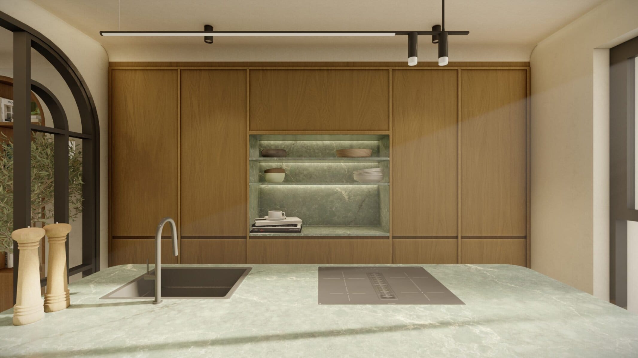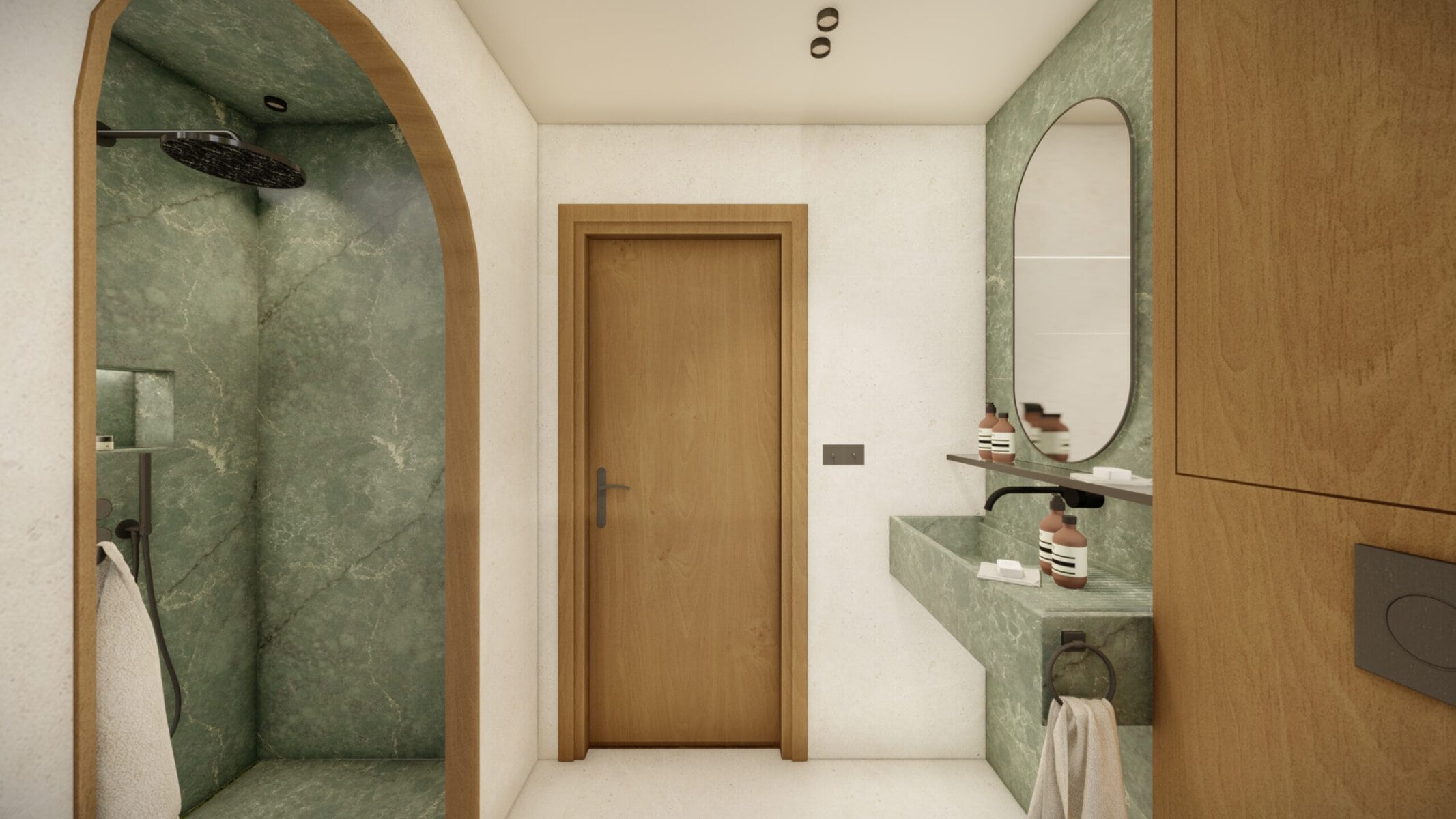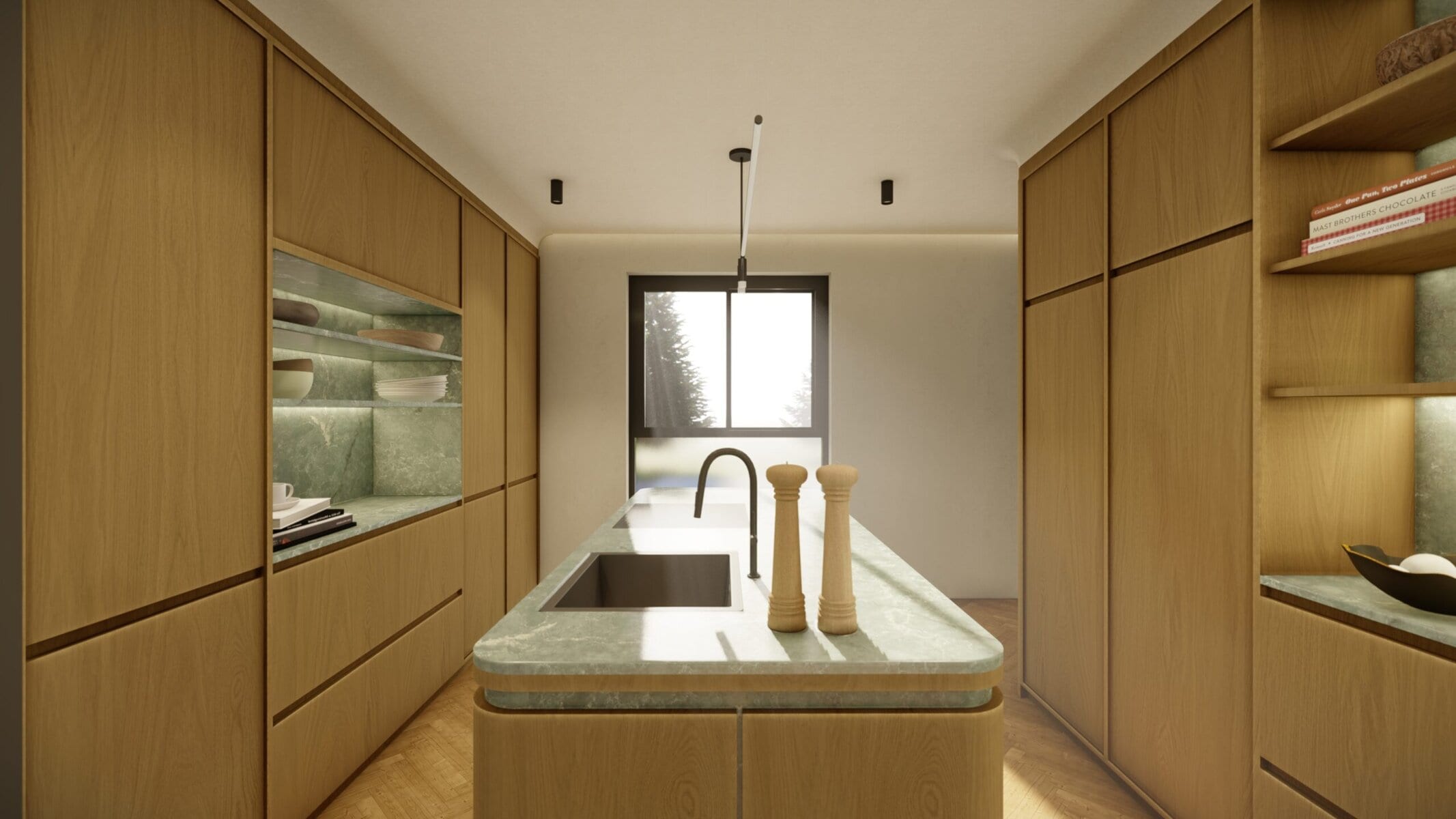 La lumière glisse sur les matières et révèle un équilibre subtil entre chaleur et minéralité : bois clair, pierre verte aux reflets profonds, enduits mats et teintes naturelles. L’appartement s’ouvre sur une terrasse baignée de soleil, prolongeant cette sensation d’espace fluide et serein.