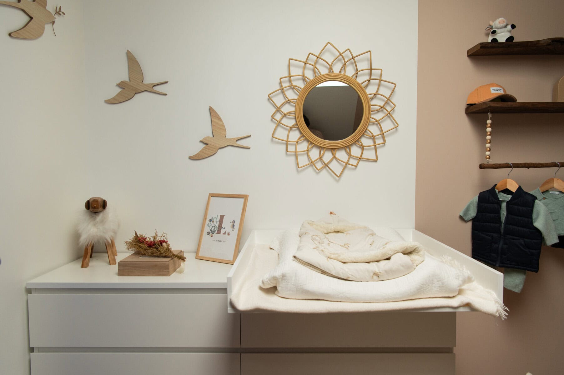 Les chambres, la salle de bain et les espaces de circulation prolongent cette signature intérieure : un univers feutré et apaisant, où la sobriété des formes met en valeur la richesse des textures. Résultat : une maison élégante, cohérente et pleine de douceur, où l’on perçoit à chaque instant le souci du détail et la recherche d’une atmosphère intemporelle.