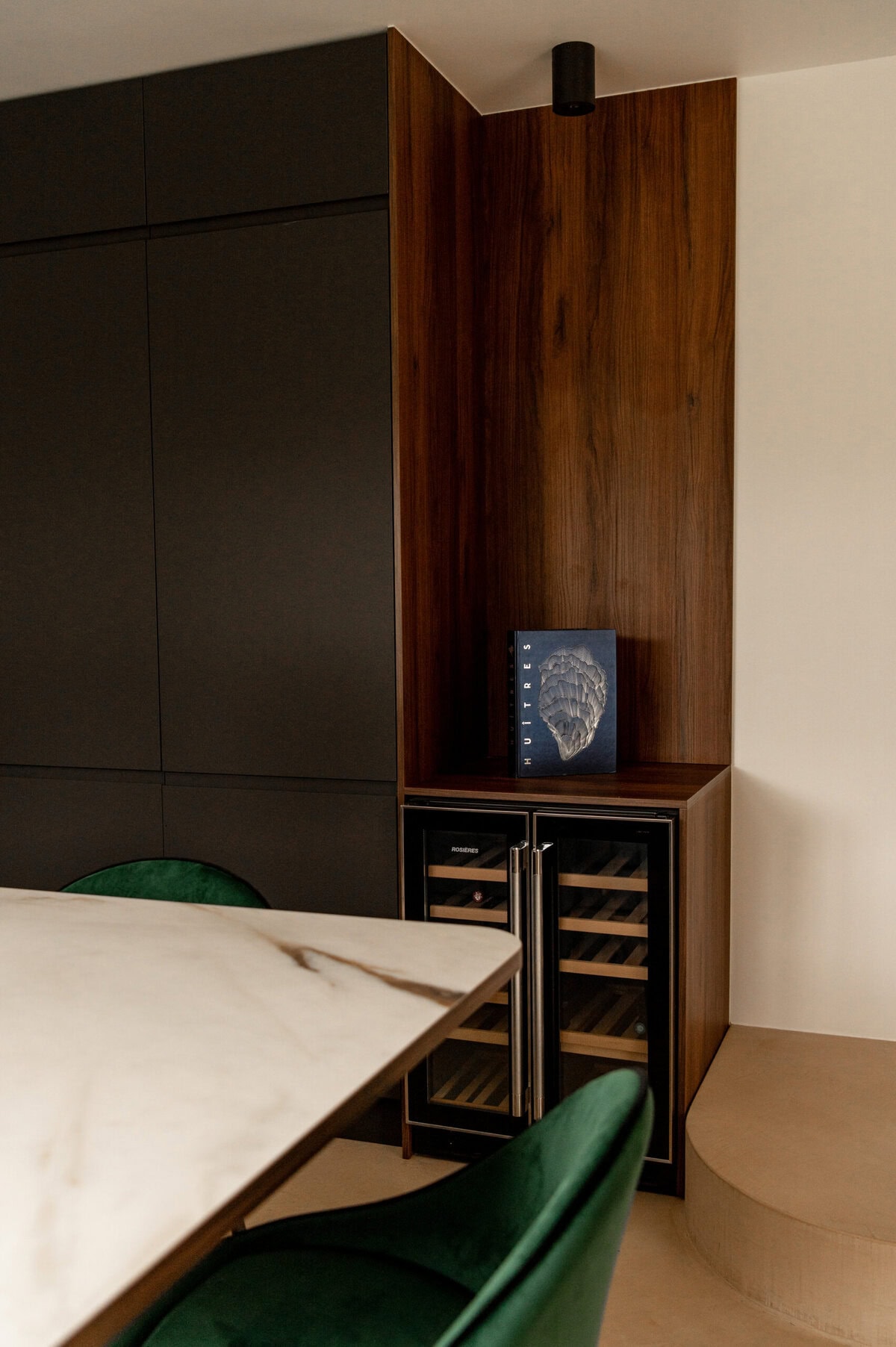 Le cœur du projet se déploie autour de la pièce de vie, véritable centre de gravité de la maison. La cuisine, élégante alliance de bois et blanc, ainsi que de marbre veiné, s’ouvre sur un salon baigné de lumière. Les lignes verticales du mur en lames rythment subtilement l’espace, tandis que les suspensions dorées apportent une touche sculpturale et contemporaine.