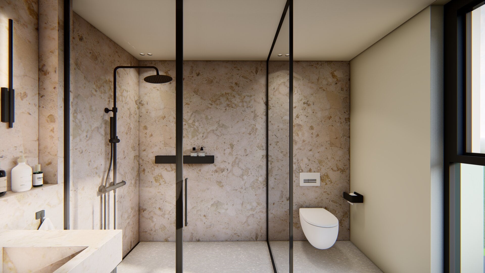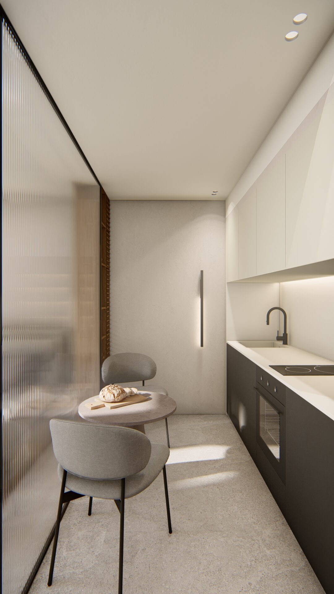 Les éléments sur mesure constituent l’âme du projet : la verrière, fabriquée à la main, s’articule autour d’un habillage mural en bois et d’une palette sobre et intemporelle. Chaque choix, chaque matériau répond à une logique précise — celle d’un minimalisme fonctionnel et apaisant.