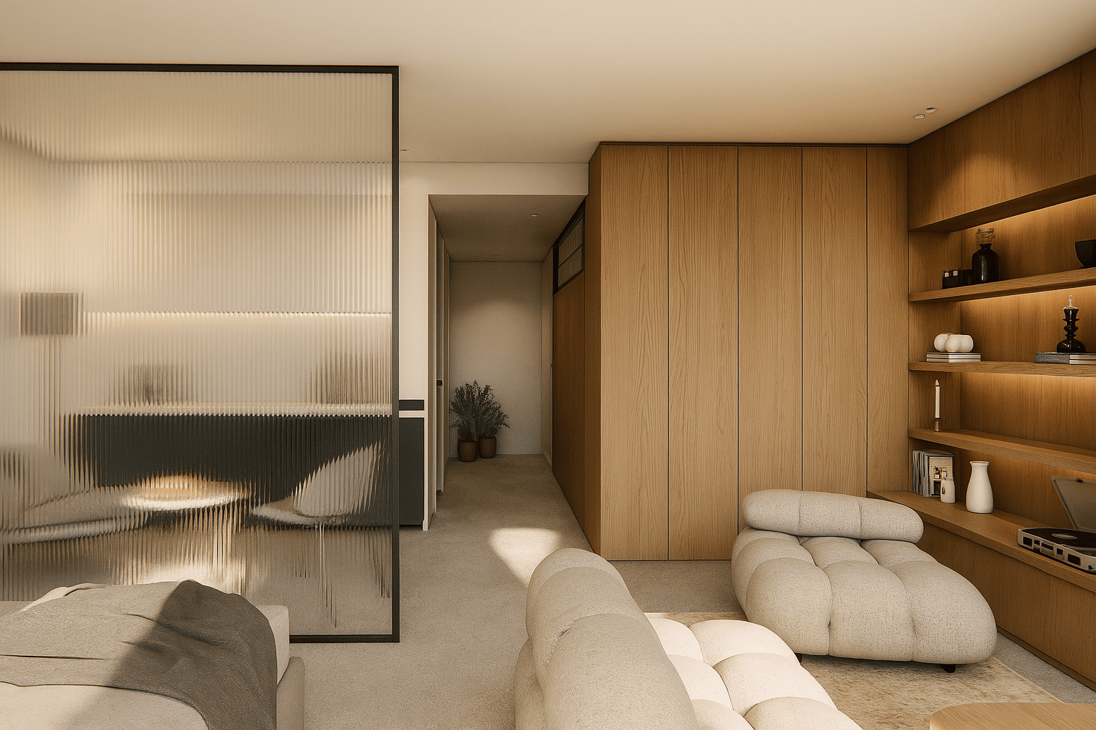 Élément central du projet, la verrière en verre flûté sépare subtilement la zone nuit tout en laissant passer la lumière naturelle. Véritable pivot architectural, elle structure sans cloisonner et devient un repère visuel fort. Autour d’elle, le bois naturel s’exprime dans les murs, les rangements intégrés et les étagères, apportant chaleur et cohérence.