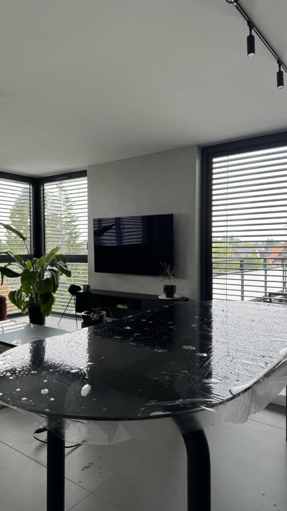 Le résultat ? Une application sans bulle, sans pli, sans bord visible. Le film fait corps avec le meuble. On peut passer la main sur la surface sans sentir de transition entre la zone protégée et la zone nue. C’est cette finition impeccable qui distingue une protection table transparent sur mesure de qualité premium d’un simple film autocollant acheté en grande surface.