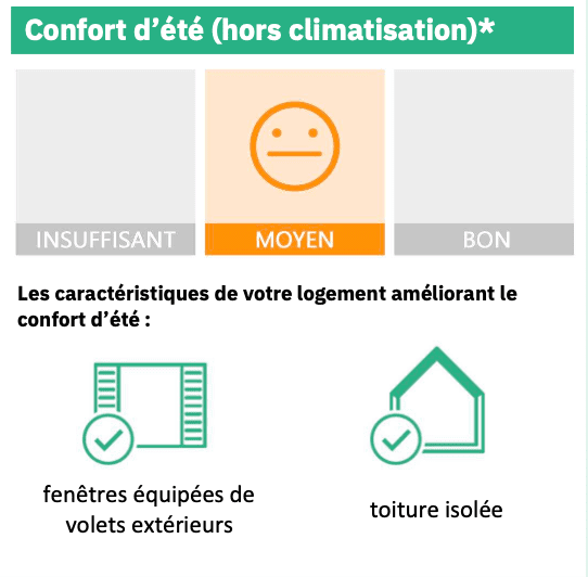 De même, la notion de confort d’été : c’est-à-dire la capacité du logement à rester frais pendant les fortes chaleurs, n’est pas encore intégrée dans la simulation. Ce paramètre dépend de nombreux éléments spécifiques (inertie des matériaux, orientation, ventilation naturelle, protections solaires, végétation environnante…) qui nécessitent une analyse technique et architecturale plus fine.
